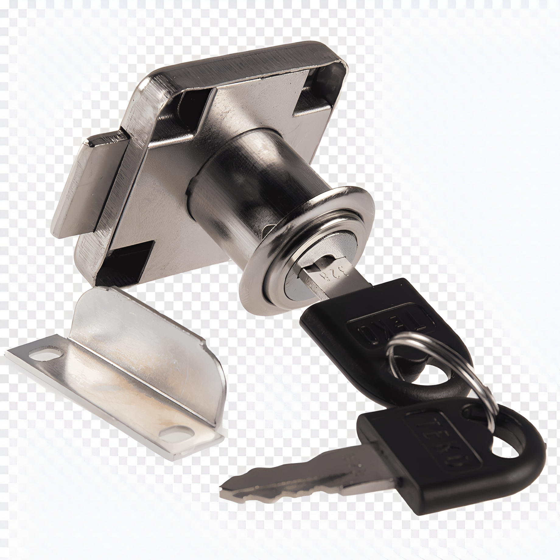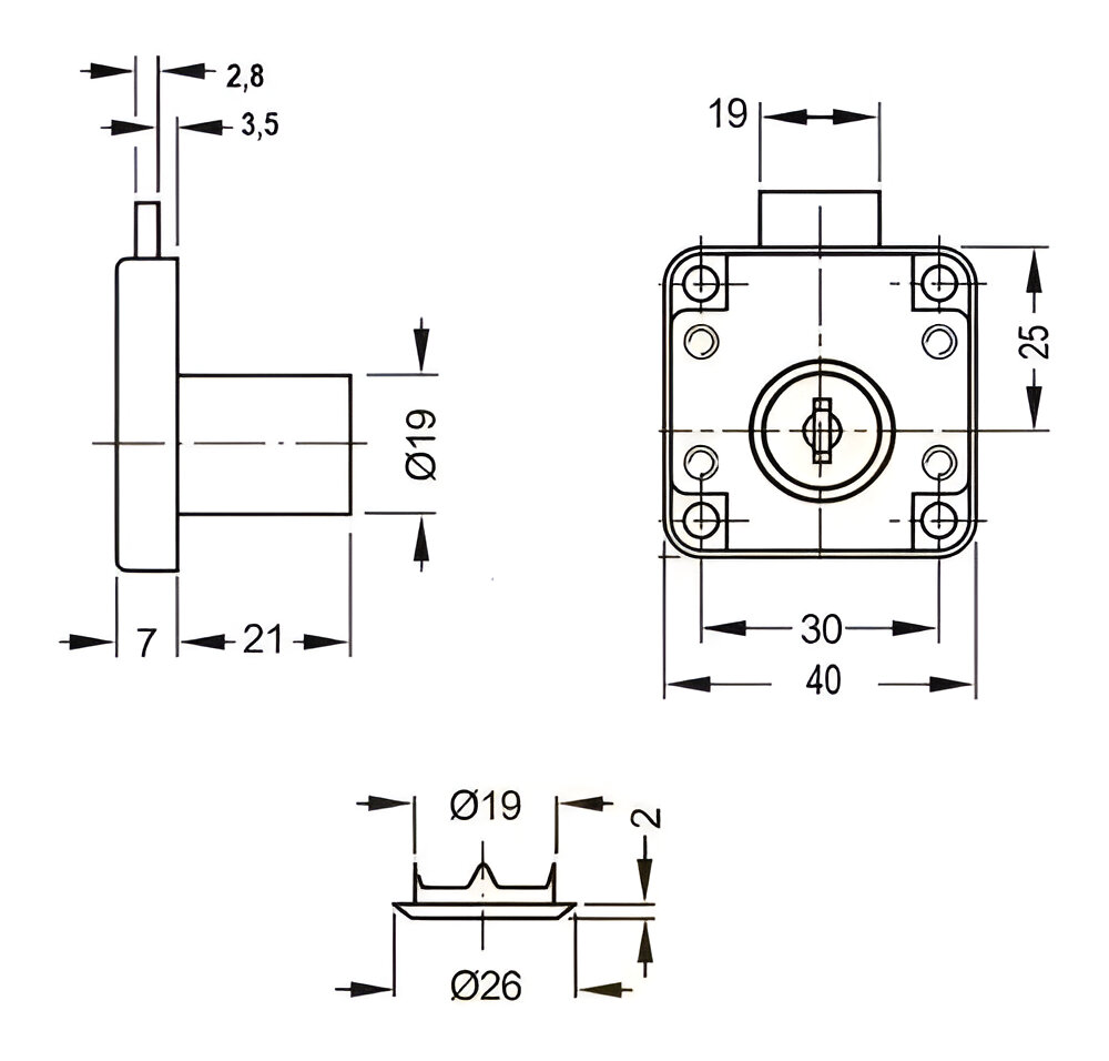 CERRADURA CAJÓN BASE CUADRADA para placa 18mm Largo: 22MM Diametro: 19MM